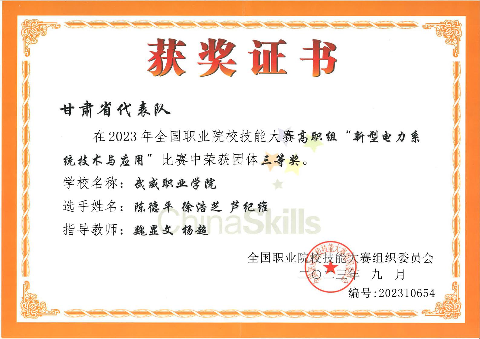 2023年全國職業(yè)院校技能大賽新型電力系統(tǒng)技術與應用賽項三等獎