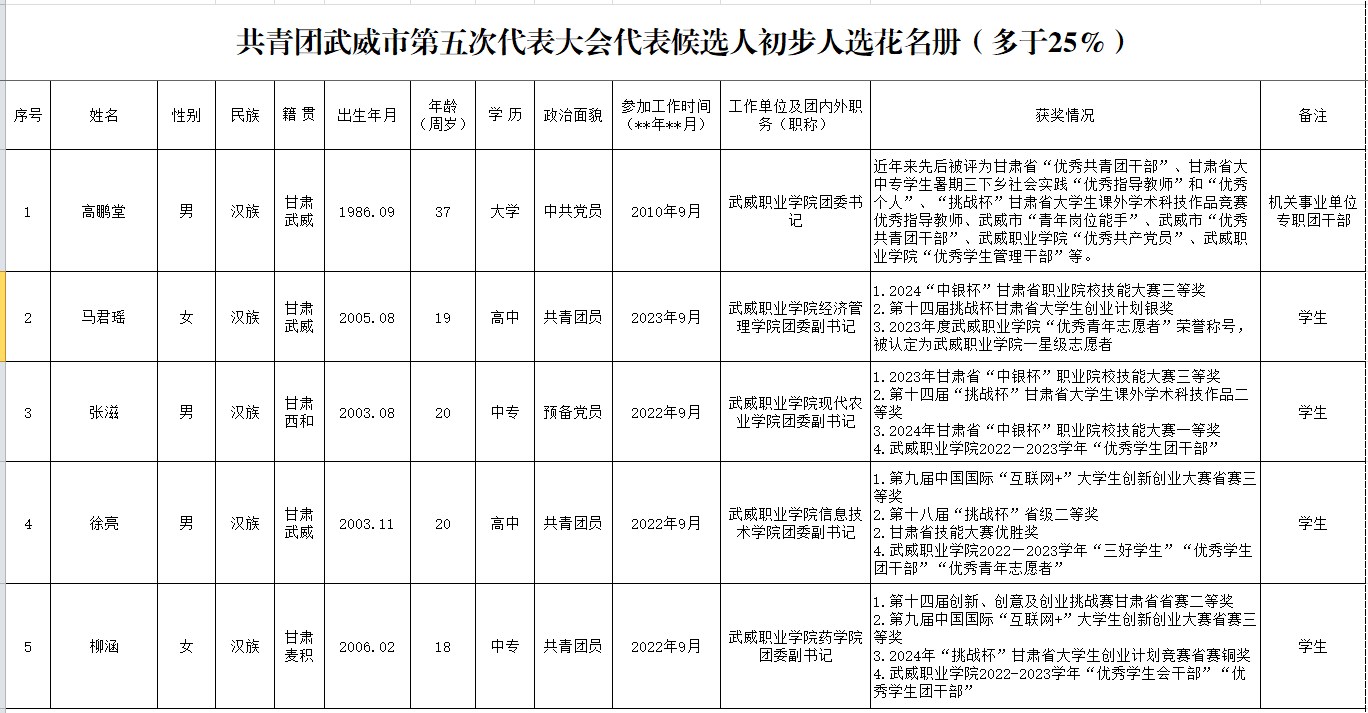 關(guān)于共青團(tuán)武威市第五次代表大會代表候選人初步人選考察情況的公示