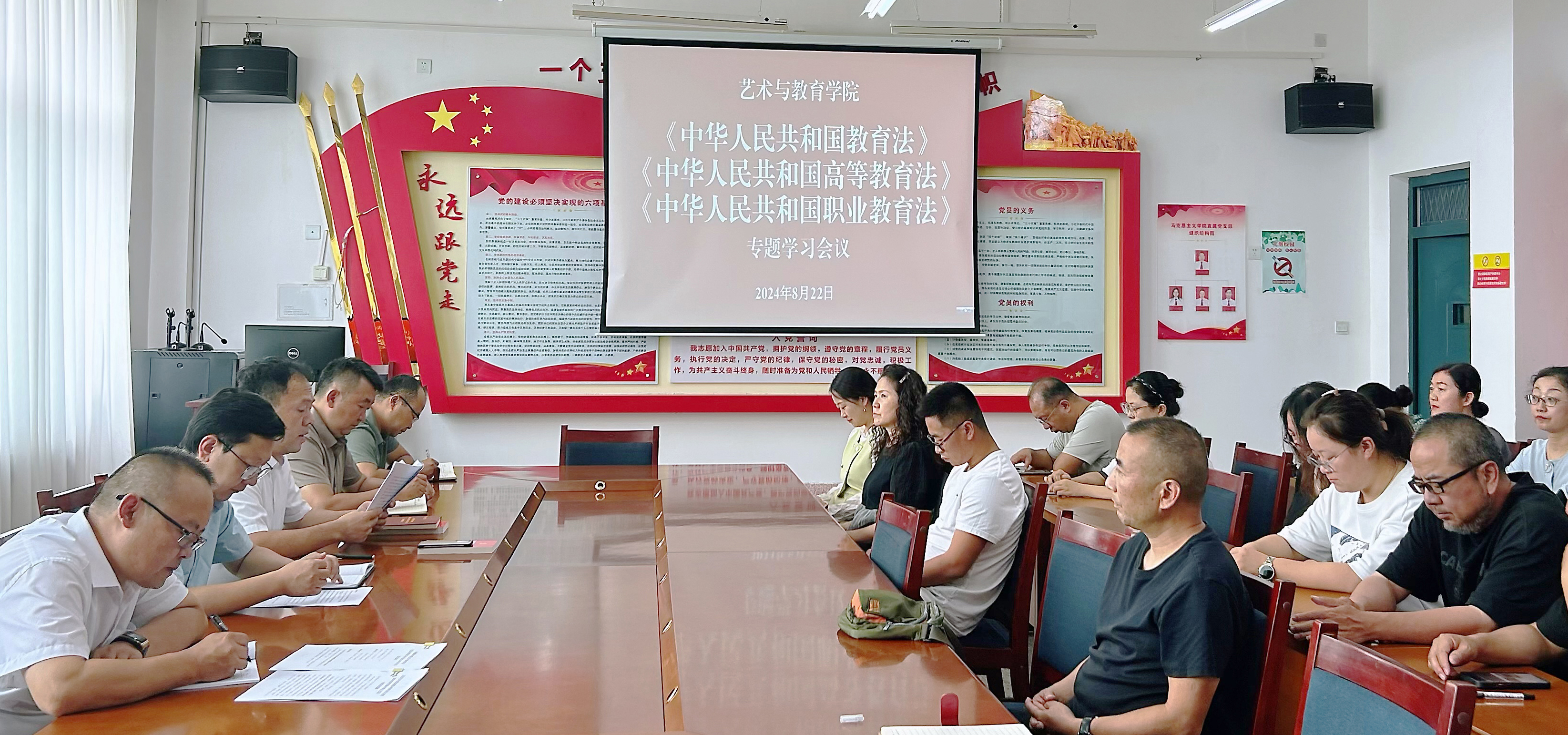 為進(jìn)一步提高教師的法律法規(guī)意識,加強(qiáng)教師的師德師風(fēng)建設(shè),轉(zhuǎn)變觀念、解放思想,樹立現(xiàn)代職業(yè)教育觀念,扎實推動教育教學(xué)工作高質(zhì)量發(fā)展,8月22日下午,藝術(shù)與教育學(xué)院組織全體教職工專題學(xué)習(xí)《中華人民共和國教育法》《中華人民共和國高等教育法》《中華人民共和國職業(yè)教育法》等教育相關(guān)法律法規(guī)及政策文件。會議由黨總支書記王政主持。