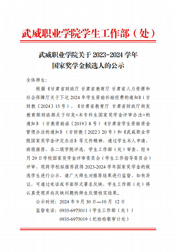 武威職業(yè)學(xué)院關(guān)于2023-2024學(xué)年國(guó)家獎(jiǎng)學(xué)金候選人的公示