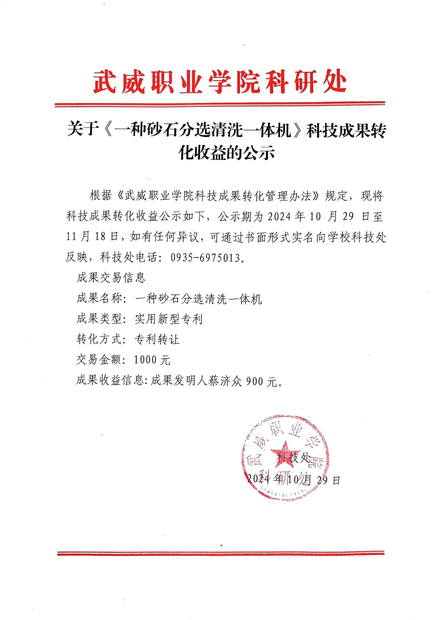 關于《一種砂石分選清洗一體機》科技成果轉化收益的公示