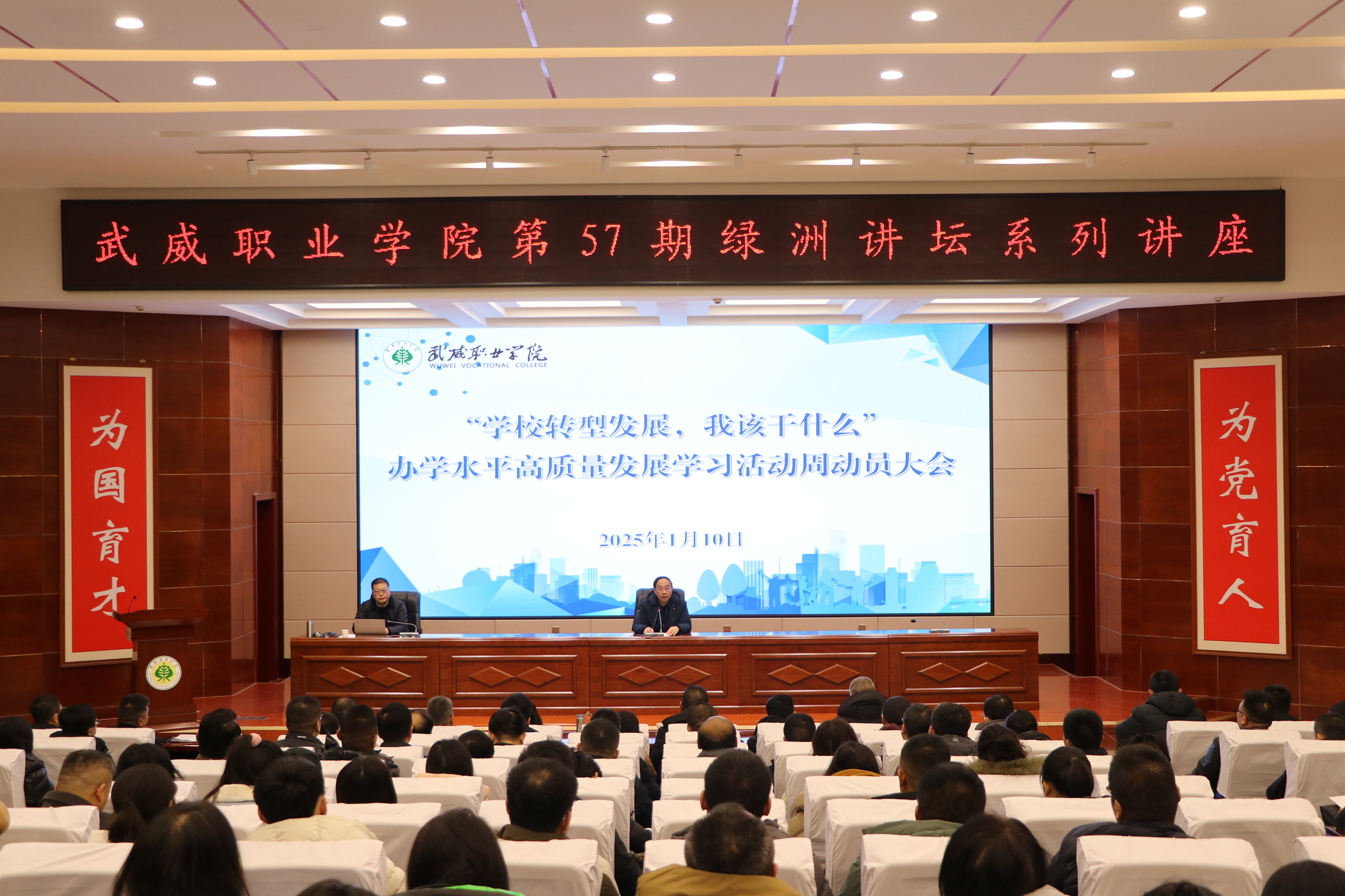 1月10日下午,學(xué)校第五十七期綠洲講壇暨辦學(xué)水平高質(zhì)量發(fā)展學(xué)習(xí)活動(dòng)周動(dòng)員大會(huì)在菁英廳順利啟動(dòng),學(xué)校領(lǐng)導(dǎo)、中層管理干部、教研室主任及教師代表共210余人參加了活動(dòng)。黨委副書記翟存祥主持活動(dòng)。