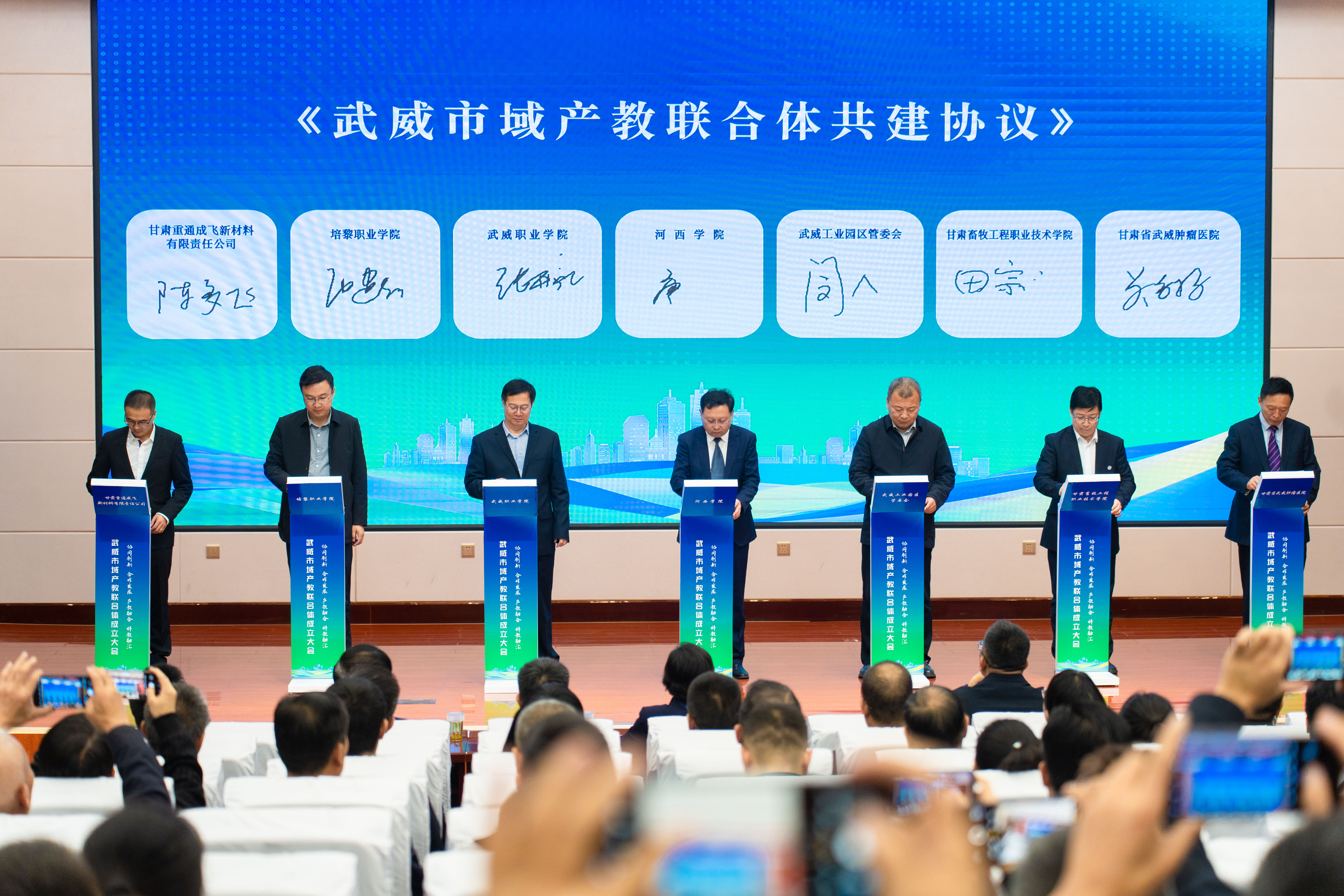 會上,與會代表審議通過了《武威市域產(chǎn)教聯(lián)合體章程》《武威市域產(chǎn)教聯(lián)合體理事會成員名單》,聯(lián)合體成員單位代表共同簽署了《武威市域產(chǎn)教聯(lián)合體共建協(xié)議》,科技局分管領導為常務副理事長單位授牌,市教育局和工信局主要領導為聯(lián)合體揭牌。