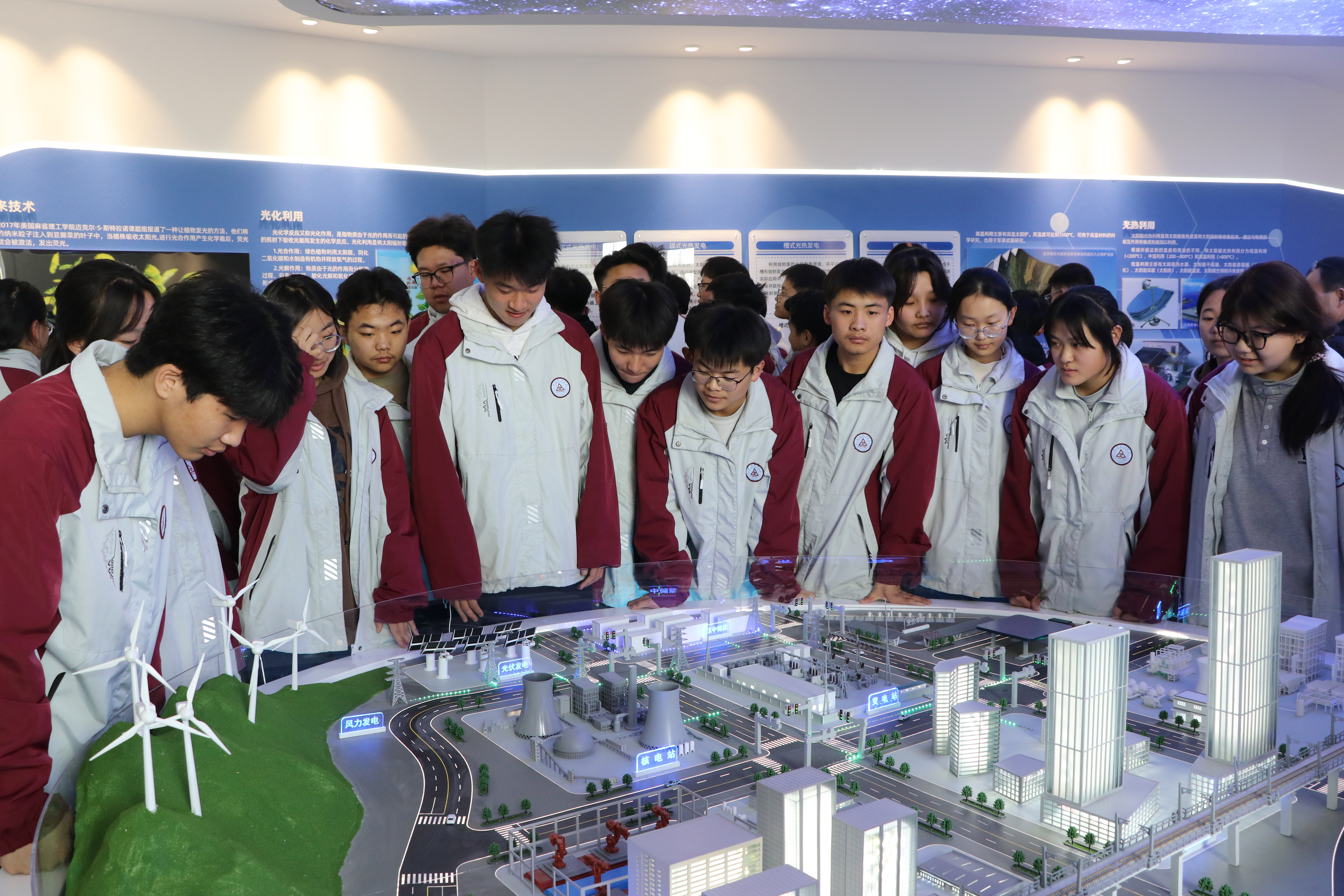 在新能源科技館講解教師講解下,學(xué)生們一邊聽一邊體驗觀摩。他們時而激烈討論其科學(xué)原理,時而著迷研究模型原理構(gòu)造,久久駐足觀看,流連忘返,可謂大飽眼福。