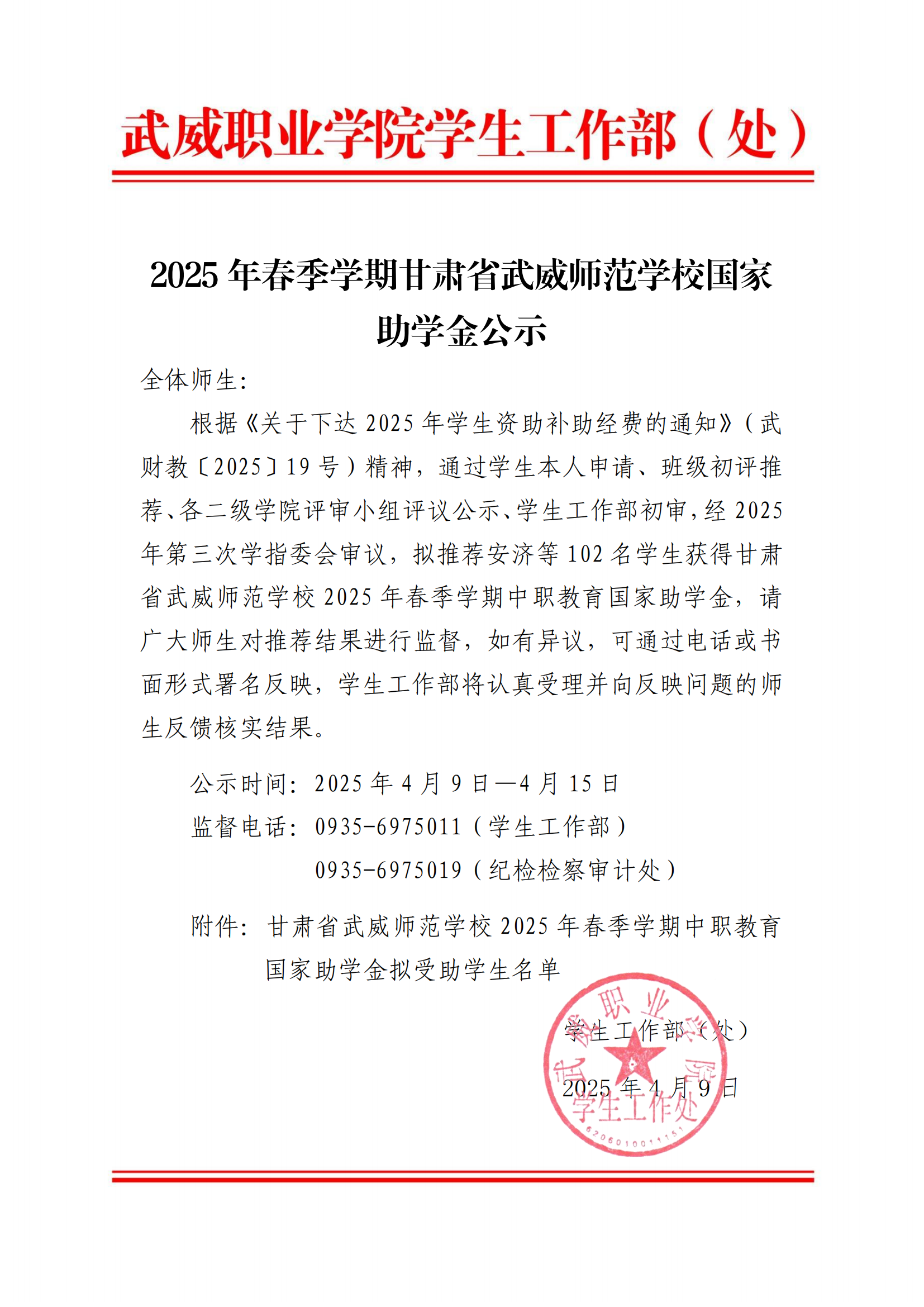 2025年春季學期甘肅省武威師范學校國家助學金公示