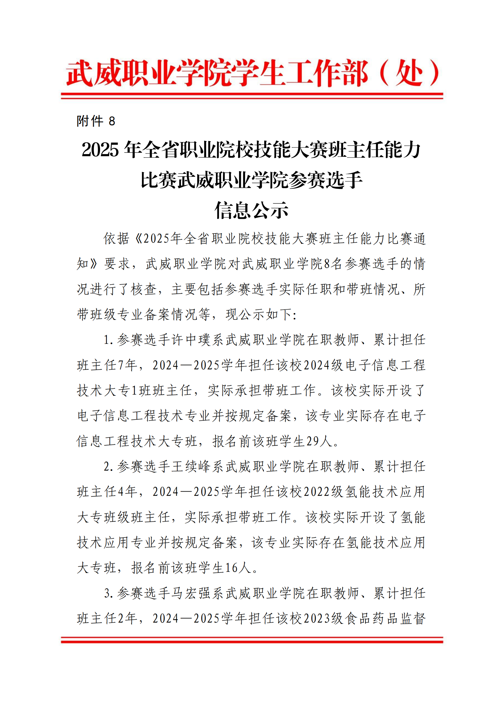 2025年全省職業(yè)院校技能大賽班主任能力比賽武威職業(yè)學(xué)院參賽選手信息公示