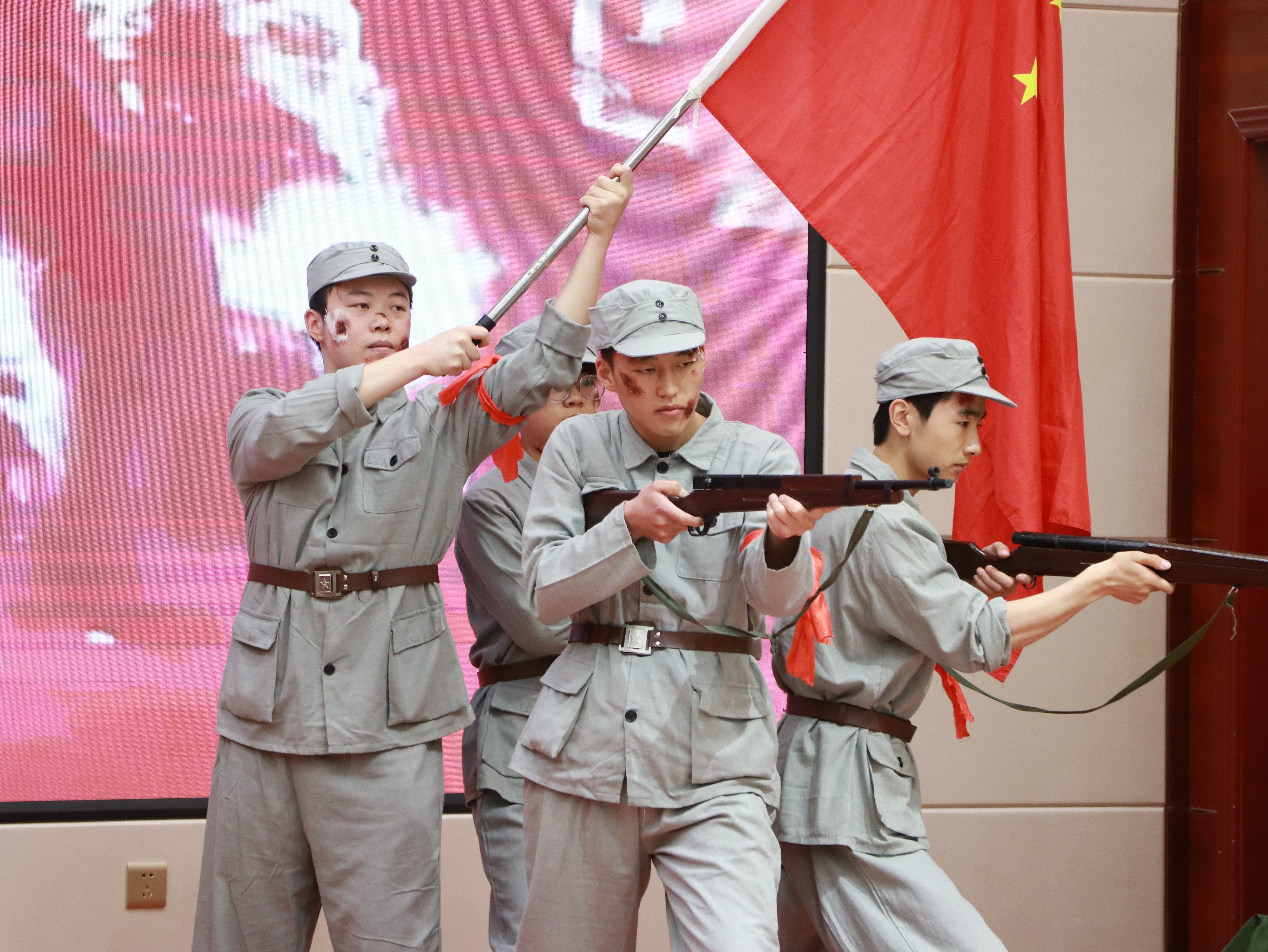比賽現(xiàn)場(chǎng),各參賽隊(duì)伍以“誦、演、歌、頌”的復(fù)合表達(dá),帶領(lǐng)觀(guān)眾穿越歷史烽煙,重現(xiàn)那段氣壯山河的抗戰(zhàn)歲月。他們或慷慨激昂地講述革命先輩寧死不屈的壯舉,或手持泛黃家書(shū)深情誦讀,絕筆信中的母愛(ài)與家國(guó)大義在顫抖的聲線(xiàn)中重現(xiàn);或化身硝煙中的戰(zhàn)士,用染血繃帶與折斷鋼槍演繹出“十萬(wàn)青年十萬(wàn)軍”的悲壯群像。那些被歲月蝕刻的墨跡,此刻正在當(dāng)代青年的瞳孔里重新燃燒。一句句飽含深情的誦讀,一幕幕震撼人心的演繹,都傳遞著同學(xué)們對(duì)抗戰(zhàn)英烈的深切緬懷與崇高敬意?,F(xiàn)場(chǎng)掌聲如潮水般此起彼伏,經(jīng)久不息,激蕩著每一位觀(guān)眾的愛(ài)國(guó)情懷。