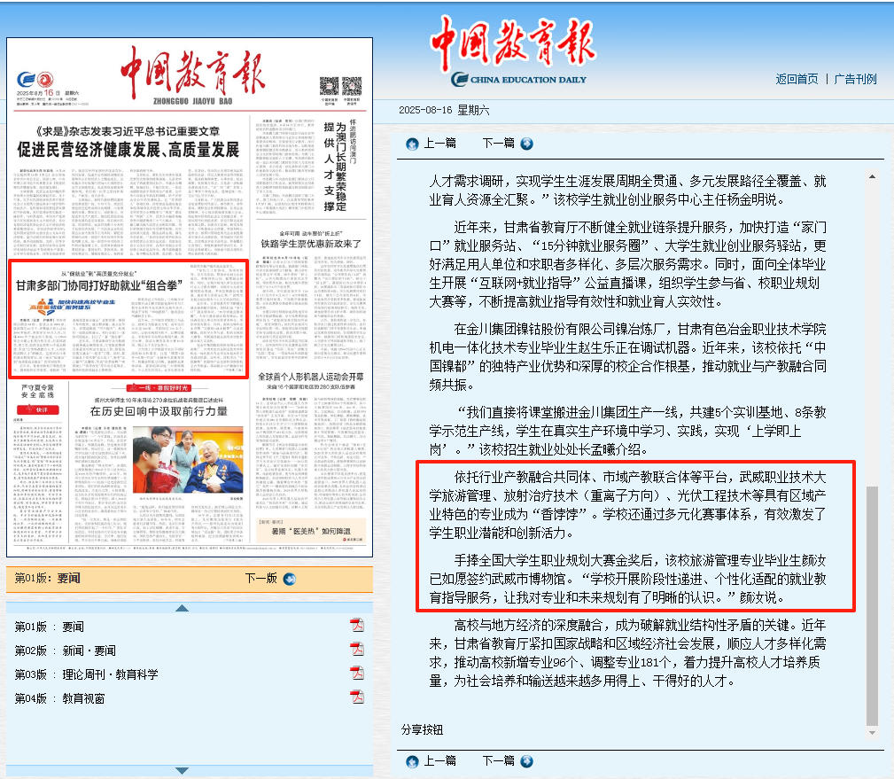 《中國教育報》關注報道武威職業(yè)技術大學產教融合促就業(yè)工作成效
