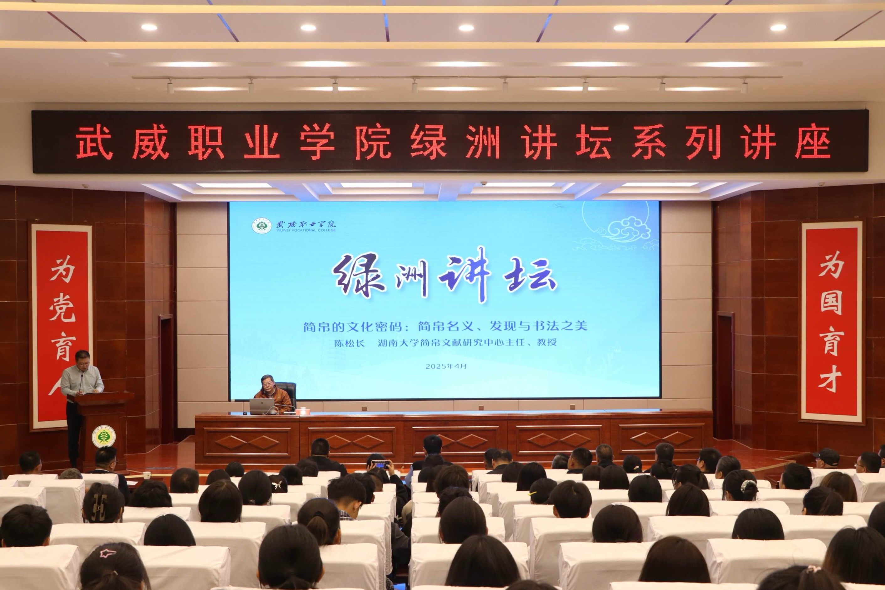 為豐富師生學(xué)術(shù)視野,深入探究歷史文化的獨特魅力,4月15日,學(xué)校特邀湖南大學(xué)岳麓書院教授、博士生導(dǎo)師、湖南大學(xué)簡帛文獻研究中心和中國簡帛書法藝術(shù)研究中心主任陳松長教授,在菁英廳作了“簡帛的文化密碼:簡帛名義、發(fā)現(xiàn)與書法之美”專題講座。校長李海軍主持講座,湖南大學(xué)師生代表、武威市涼州文化研究院研究人員、學(xué)校師生代表、媒體記者共210余人參加。