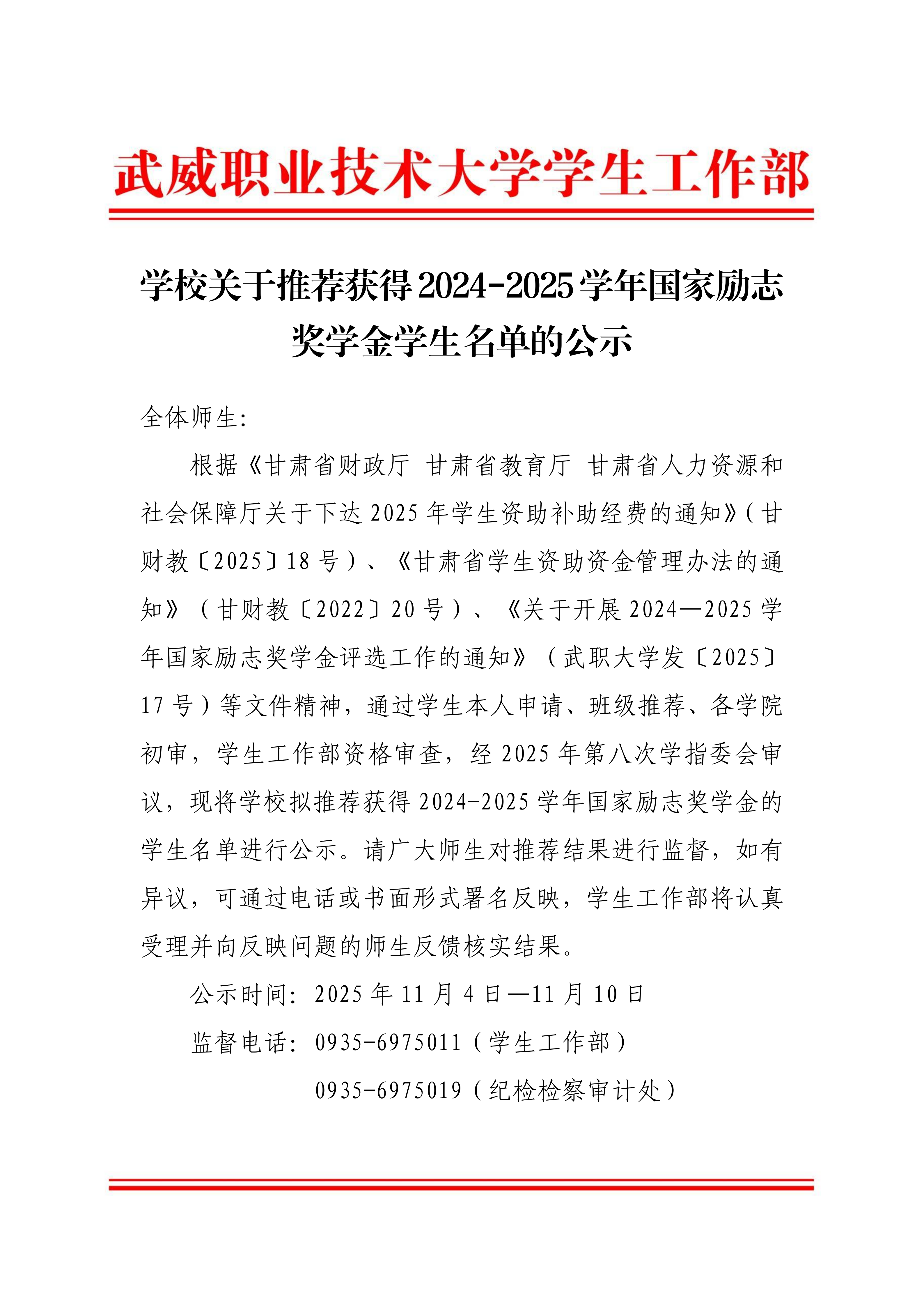 學(xué)校關(guān)于推薦獲得2024-2025學(xué)年國(guó)家勵(lì)志獎(jiǎng)學(xué)金學(xué)生名單的公示