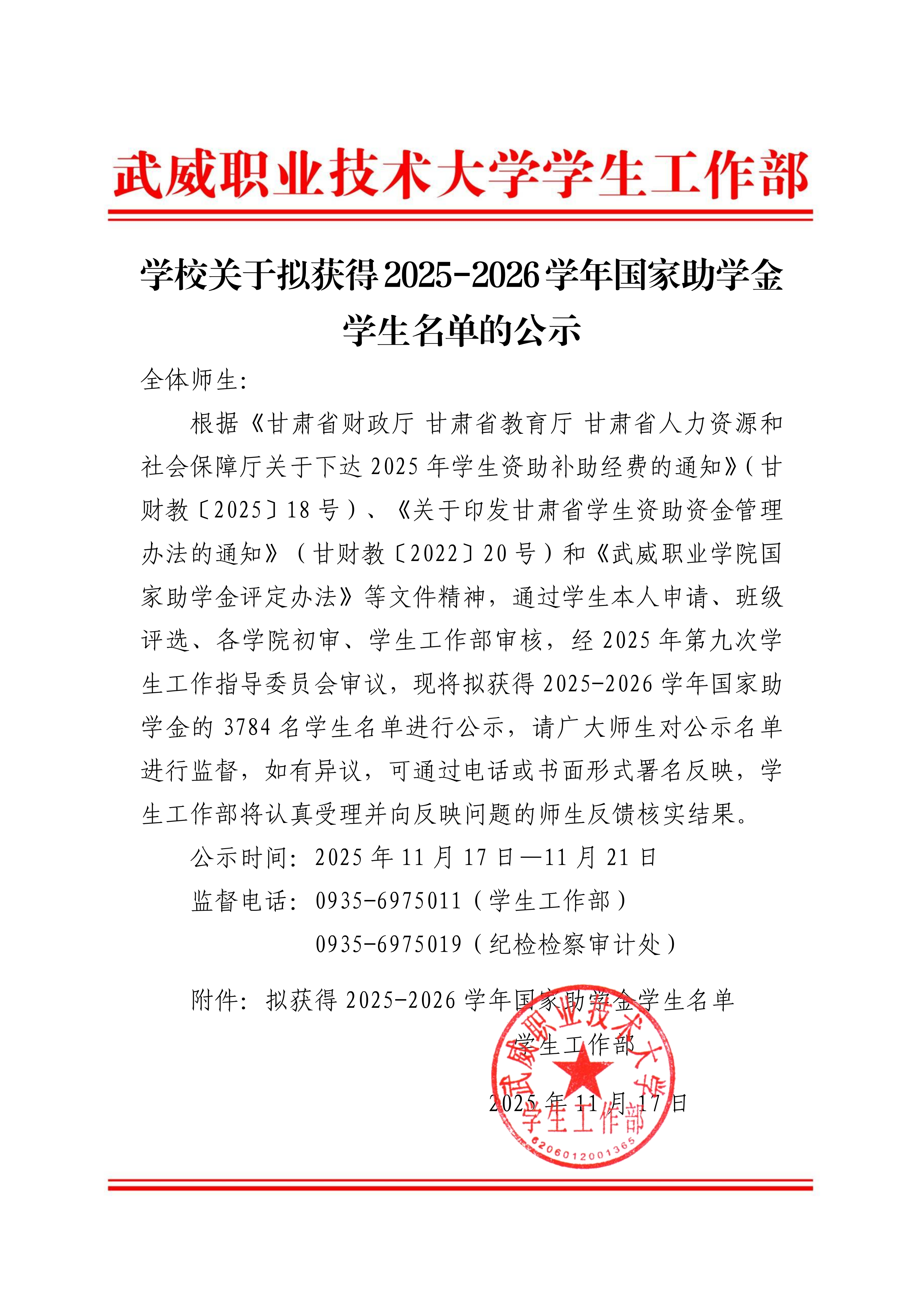 學(xué)校關(guān)于擬獲得2025-2026學(xué)年國家助學(xué)金學(xué)生名單的公示
