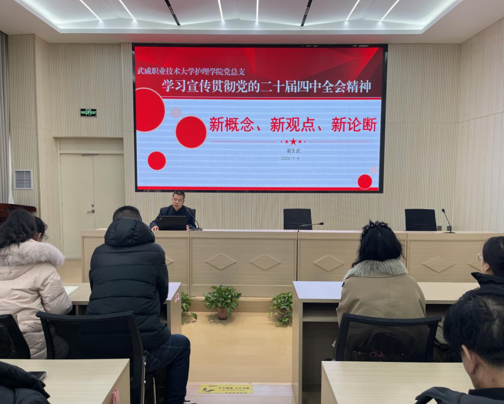 為深入學(xué)習(xí)貫徹黨的二十屆四中全會(huì)精神,準(zhǔn)確把握國家“十五五”時(shí)期發(fā)展藍(lán)圖與戰(zhàn)略部署,護(hù)理學(xué)院于1月4日下午在圖書館報(bào)告廳召開專題宣講會(huì)。學(xué)院黨總支書記藺生武作宣講報(bào)告,全體教職工、入黨積極分子及學(xué)生代表等80余人參加。