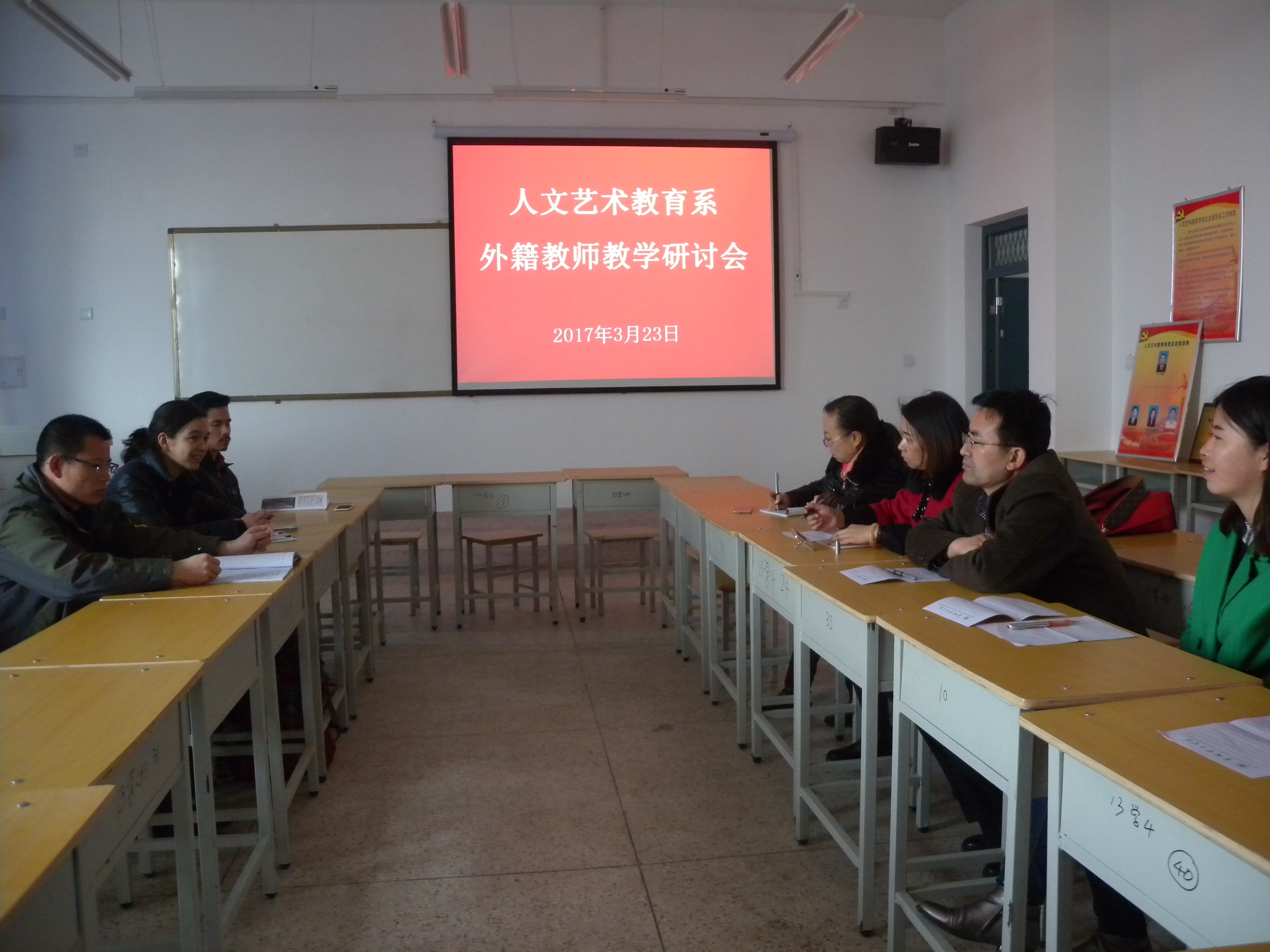 3月23日下午,人文藝術(shù)教育系在勵(lì)勤樓403教室召開(kāi)了外籍教師教學(xué)研討會(huì)。會(huì)議由文英教研室主任趙金存老師主持,文英教研室全體英語(yǔ)老師、美中友好志愿者志愿教師MARIA(羅曼麗)和JUSTIN(王杰)及美中友好志愿者志管理人員臧百鵬老師參加了會(huì)議。