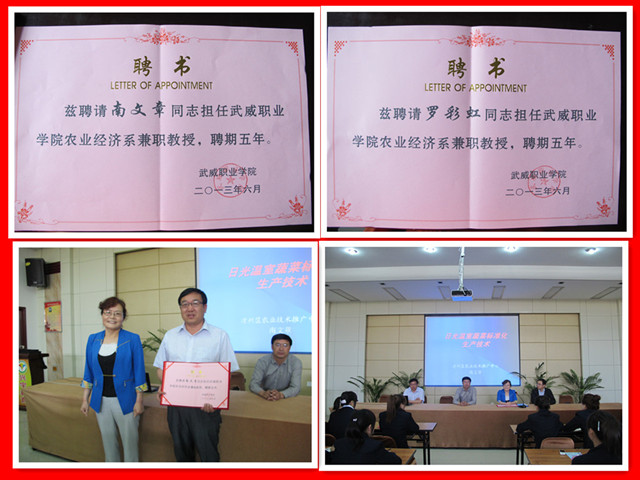 實(shí)訓(xùn)工作開幕式上,農(nóng)業(yè)經(jīng)濟(jì)系聘請武威市涼州區(qū)農(nóng)技推廣中心高級農(nóng)藝師南文章和羅彩虹同志為武威職業(yè)學(xué)院農(nóng)業(yè)經(jīng)濟(jì)系兼職教授。南文章教授為全體師生做了題為《日光溫室蔬菜標(biāo)準(zhǔn)化生產(chǎn)技術(shù)》的專題講座。