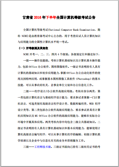5.詳細(xì)信息請參看甘肅省教育考試院《關(guān)于做好2016年9月全國計算機等級考試網(wǎng)上報名工作的通知》(甘教考院〔2016〕95號文件)及《甘肅省2016下半年全國計算機等級考試公告》(已傳至群文件)。
