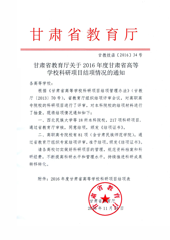 轉(zhuǎn)發(fā)甘肅省教育廳關(guān)于2016年度甘肅省高等學??蒲许椖拷Y(jié)項情況的通知