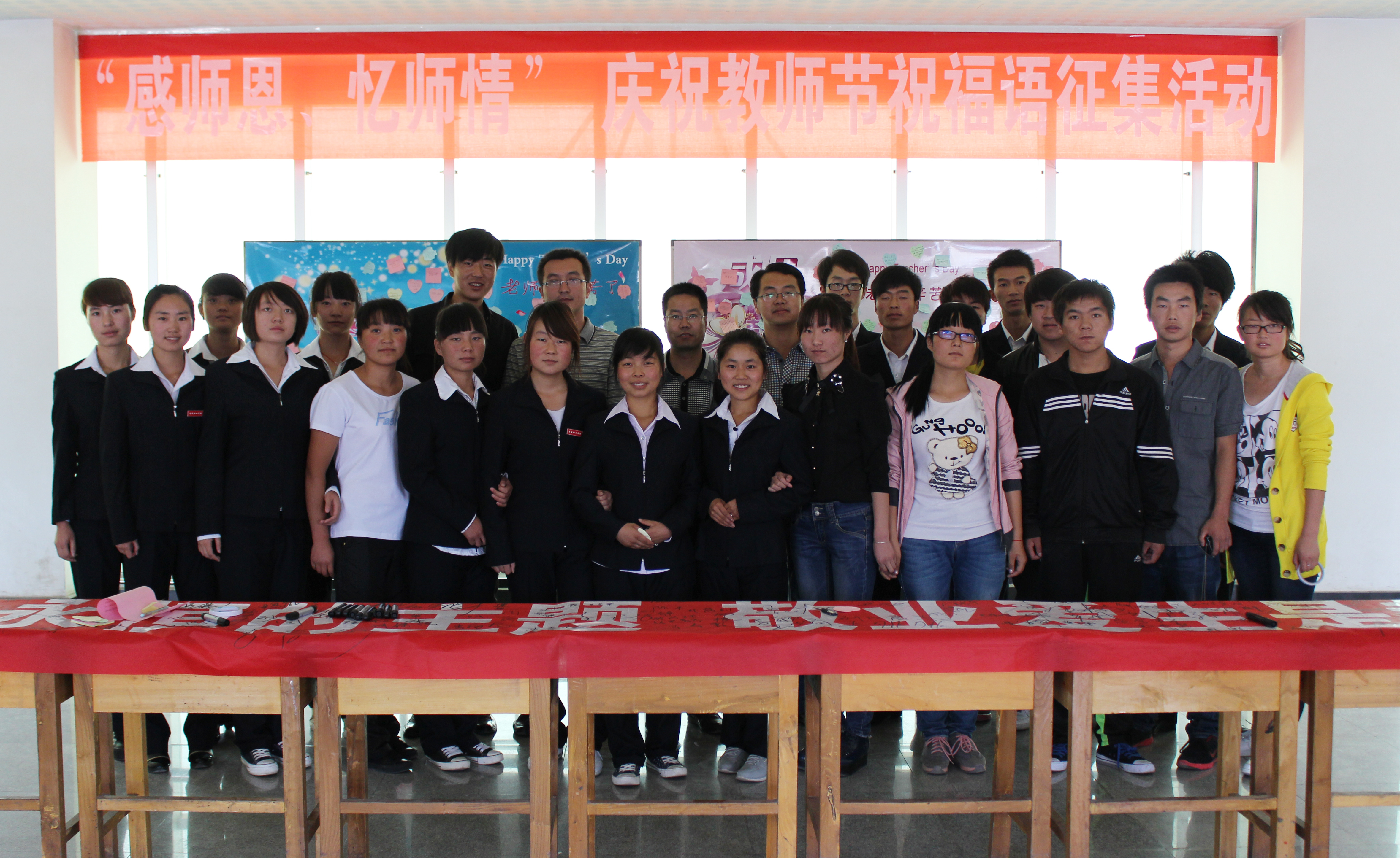 又是金秋九月,第29個(gè)教師節(jié)踏著輕盈的腳步緩緩而來(lái)。 今天,電子信息工程系舉辦“感師恩、憶師情”慶祝教師節(jié)祝福語(yǔ)征集暨師生簽名活動(dòng)。早晨七點(diǎn)三十分,活動(dòng)在一聲聲“老師,您辛苦了!祝您教師節(jié)快樂(lè)!”的祝福中拉開帷幕。上午十點(diǎn),電子信息工程系全體教師和300多名學(xué)生在一號(hào)教學(xué)樓三樓參加了主題簽名儀式,并將祝??ㄙN在主題海報(bào)上。