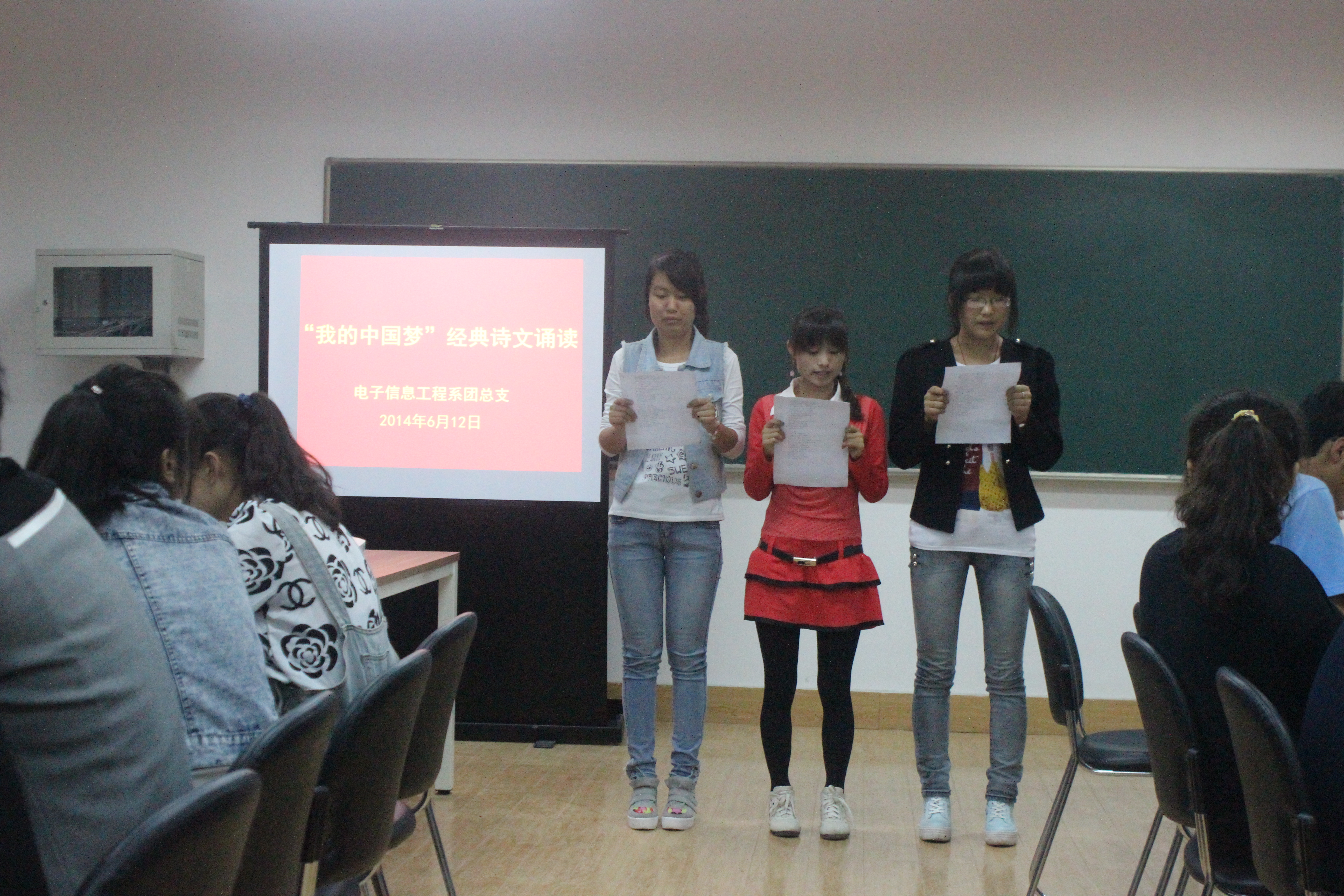 為進(jìn)一步培育和弘揚(yáng)社會(huì)主義核心價(jià)值觀,讓學(xué)生在經(jīng)典誦讀中觸摸中國傳統(tǒng)文化,增強(qiáng)愛國主義情懷,提升學(xué)生的文化底蘊(yùn)和人文素養(yǎng),深入開展中國特色社會(huì)主義宣傳教育,教育和引導(dǎo)大學(xué)生樹立正確的理想信念,努力為實(shí)現(xiàn)國家富強(qiáng)、民族復(fù)興、人民幸福的偉大“中國夢”而努力。電子信息工程系團(tuán)總支于6月12日晚在MIDP移動(dòng)互聯(lián)網(wǎng)學(xué)院教研室舉辦“我的中國夢”經(jīng)典愛國詩文誦讀活動(dòng)。