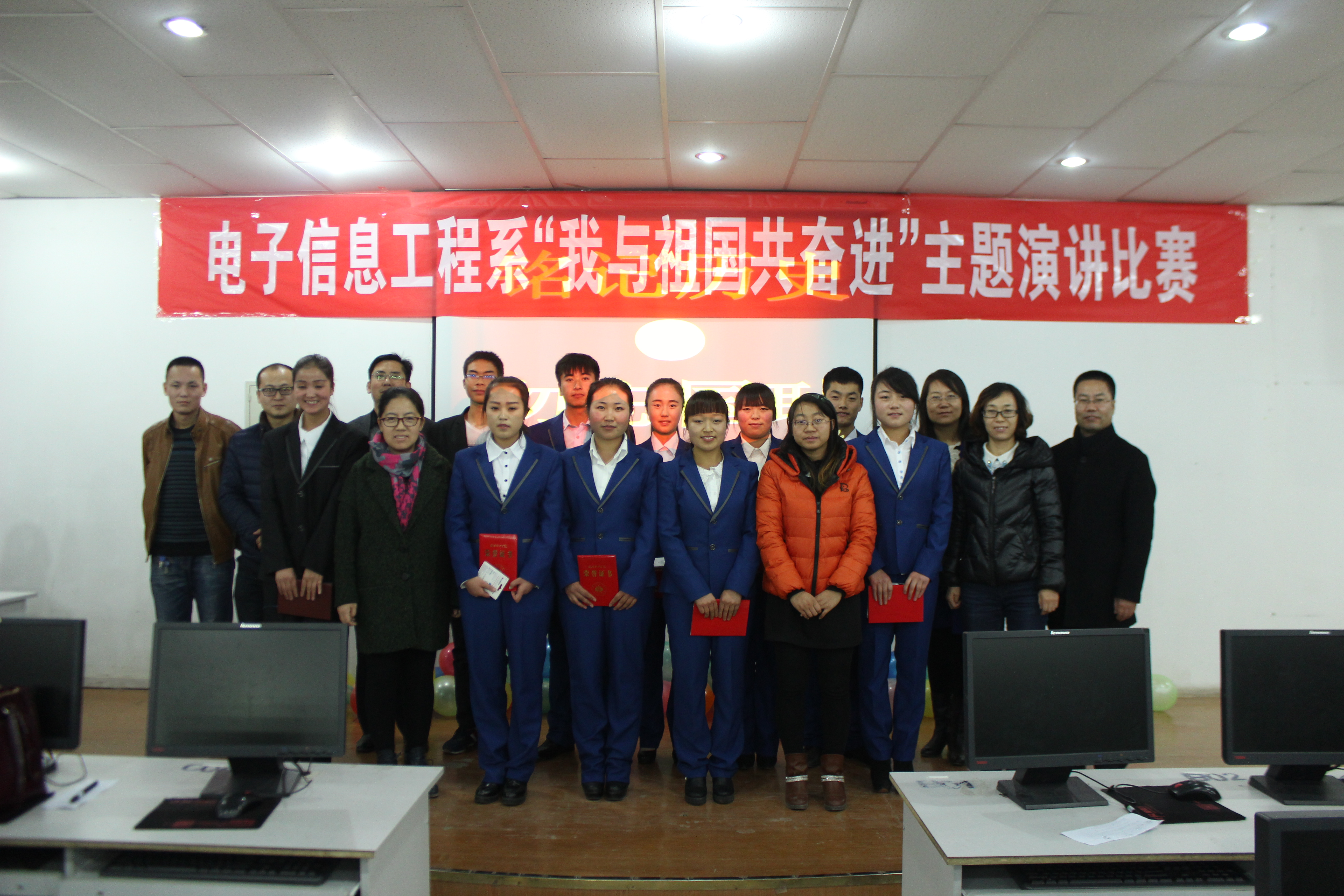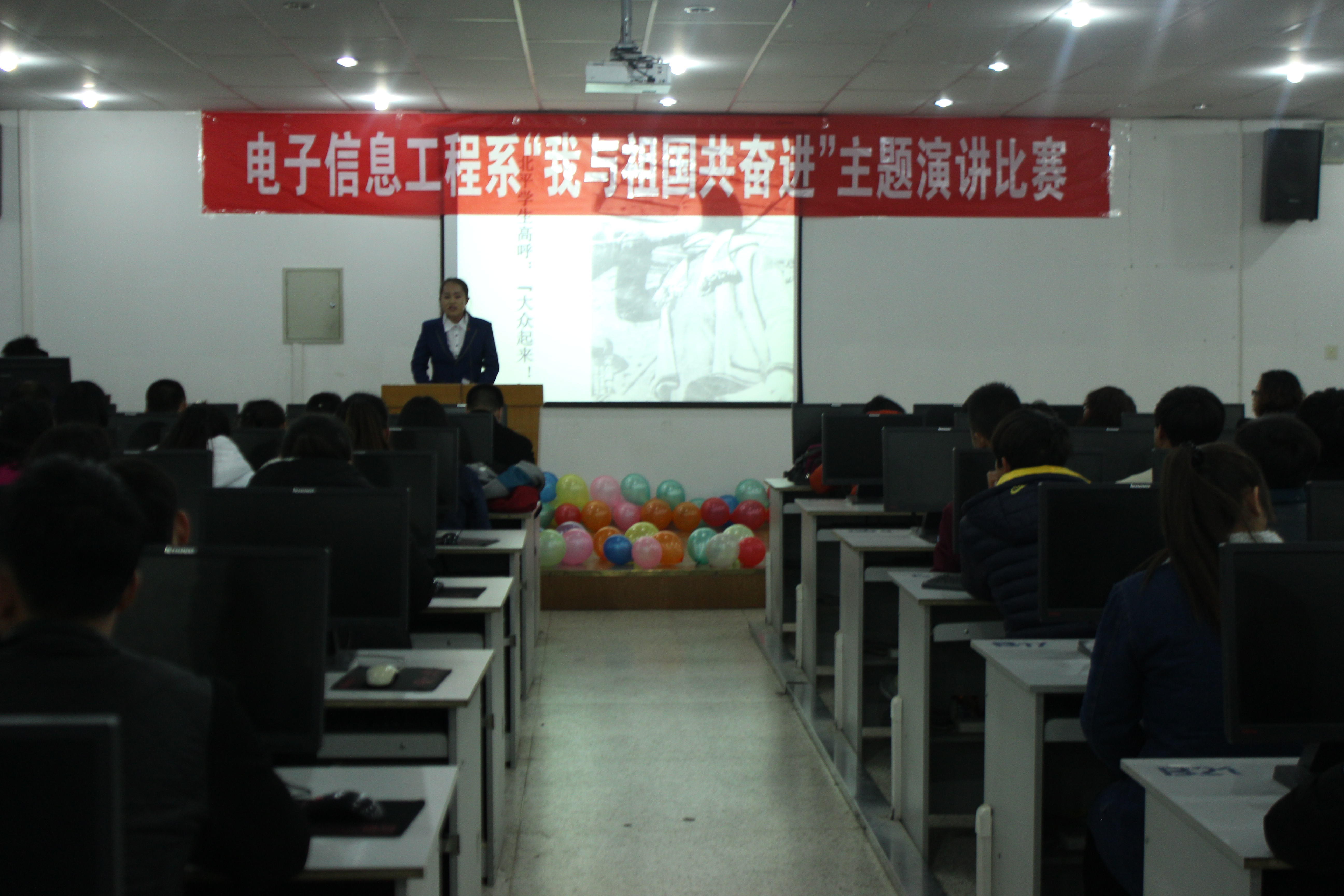 為紀念“12·9”學(xué)生愛國運動80周年,激發(fā)我系青年學(xué)生的愛國熱情和報國之志,進一步培育和踐行社會主義核心價值觀,提高學(xué)生思想政治素質(zhì),12月6日晚,電子信息工程系在尚德樓11號機房舉辦了“我與祖國共奮進”主題演講比賽。電子信息工程系黨總支書記張伯成、輔導(dǎo)員鄧偉華、團總支書記唐宗舜、全體班主任及系團總支180多名團員青年觀看了比賽。