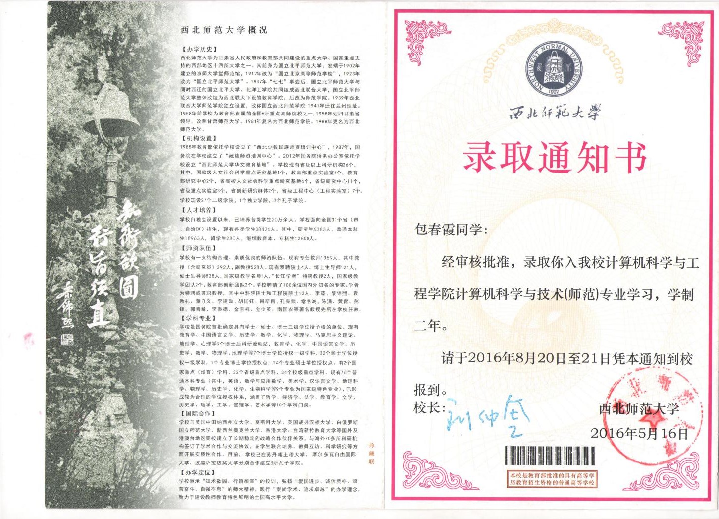 近日傳來喜訊,我系13級計算機(jī)應(yīng)用大專班包春霞同學(xué)在2016年甘肅省專升本考試中,被西北師范大學(xué)計算機(jī)科學(xué)與工程學(xué)院錄取。