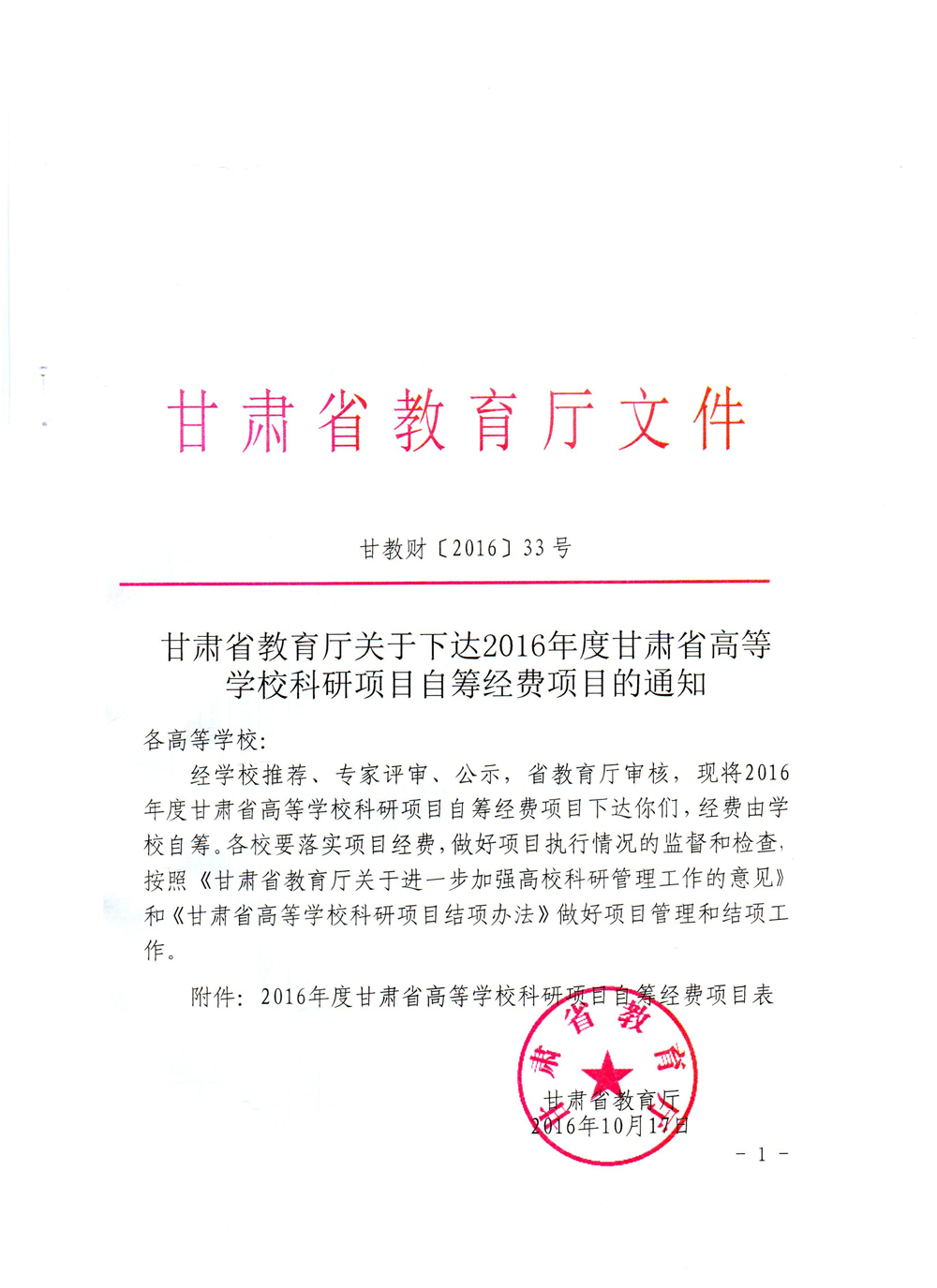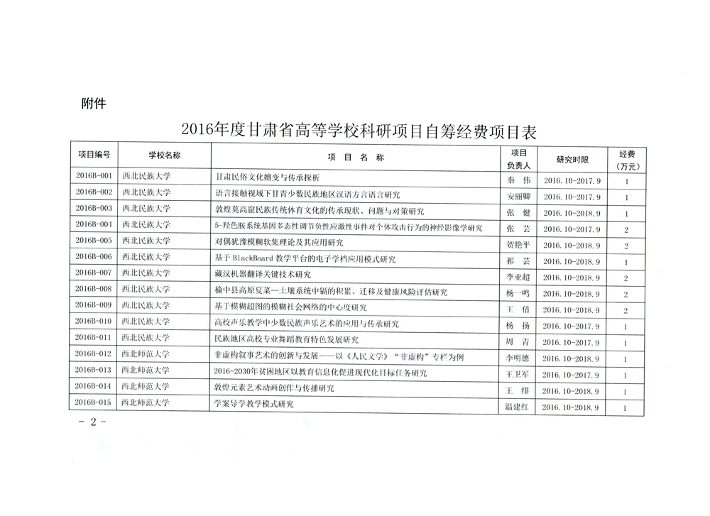 甘肅省教育廳關(guān)于下達(dá)2016年度甘肅省高等學(xué)校科研項(xiàng)目自籌經(jīng)費(fèi)項(xiàng)目的通知