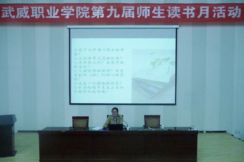 為在全院師生中營造良好的讀書氛圍,豐富校園文化生活,在第22個世界讀書日來臨之際,4月20日,武威職業(yè)學院第九屆讀書月活動專題講座在正德廳舉行。學院中文專業(yè)副教授、電子信息工程系主任李亞梅應邀進行了《為何而讀書》的專題講座,近300名師生參加了此次講座。