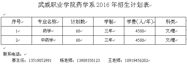 武威職業(yè)學院藥學系2016年招生計劃