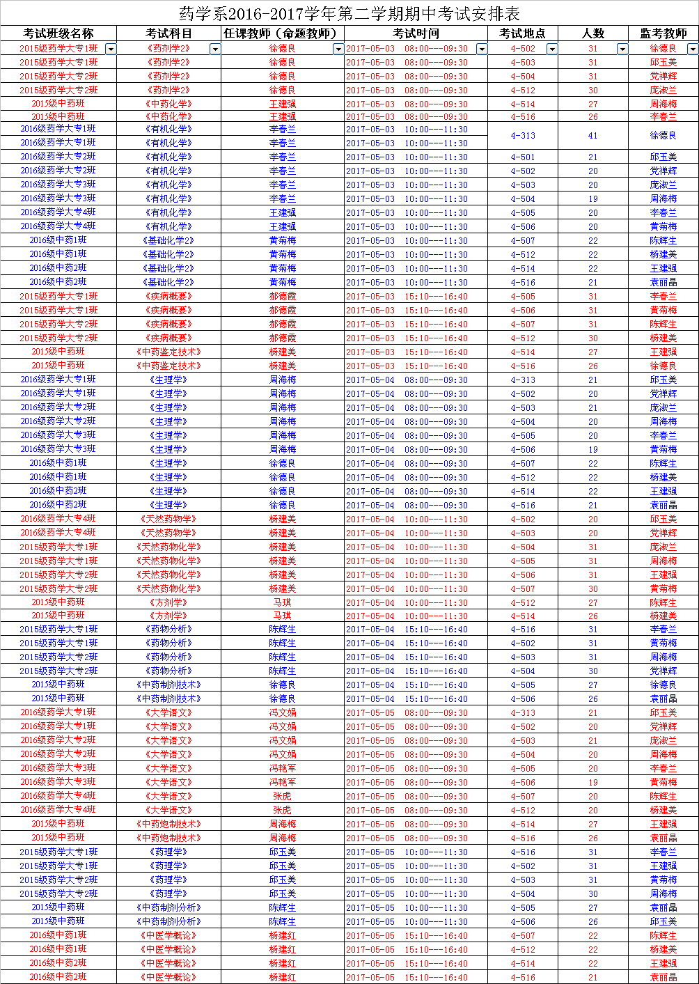 藥學(xué)系2016-2017學(xué)年第二學(xué)期期中考試安排表