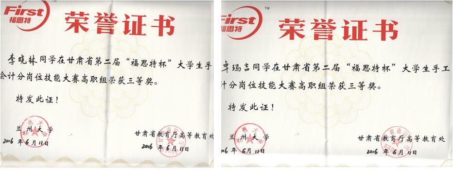 經(jīng)濟(jì)管理系會(huì)計(jì)電算化大專(zhuān)班四名學(xué)生在李惠蘭老師帶領(lǐng)下于2016年6月10日赴蘭州大學(xué)參加了甘肅省第二屆“福思特”大學(xué)生手工會(huì)計(jì)分崗位技能競(jìng)賽。