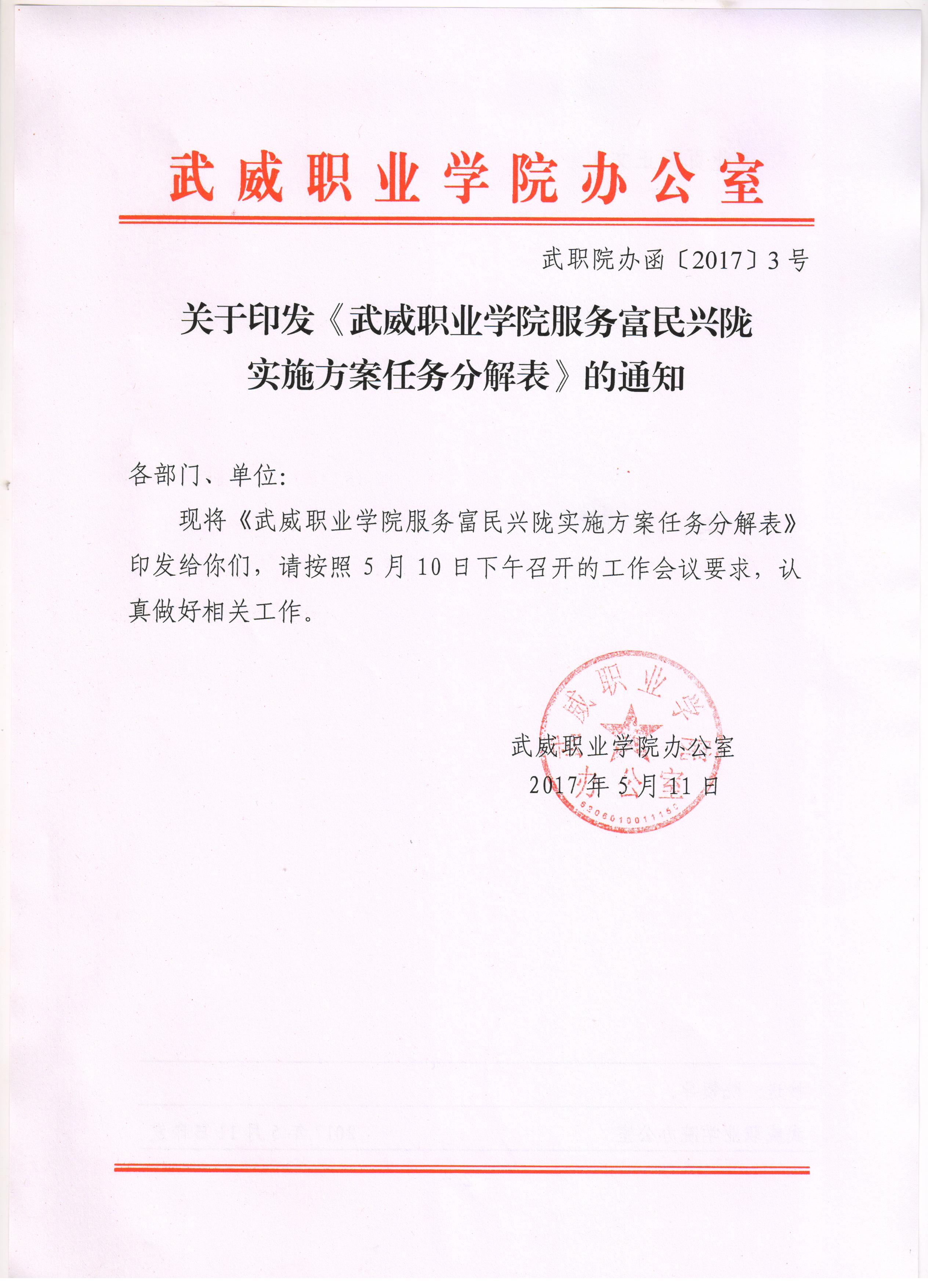 關(guān)于印發(fā)《武威職業(yè)學(xué)院服務(wù)富民興隴實施方案任務(wù)分解表》的通知