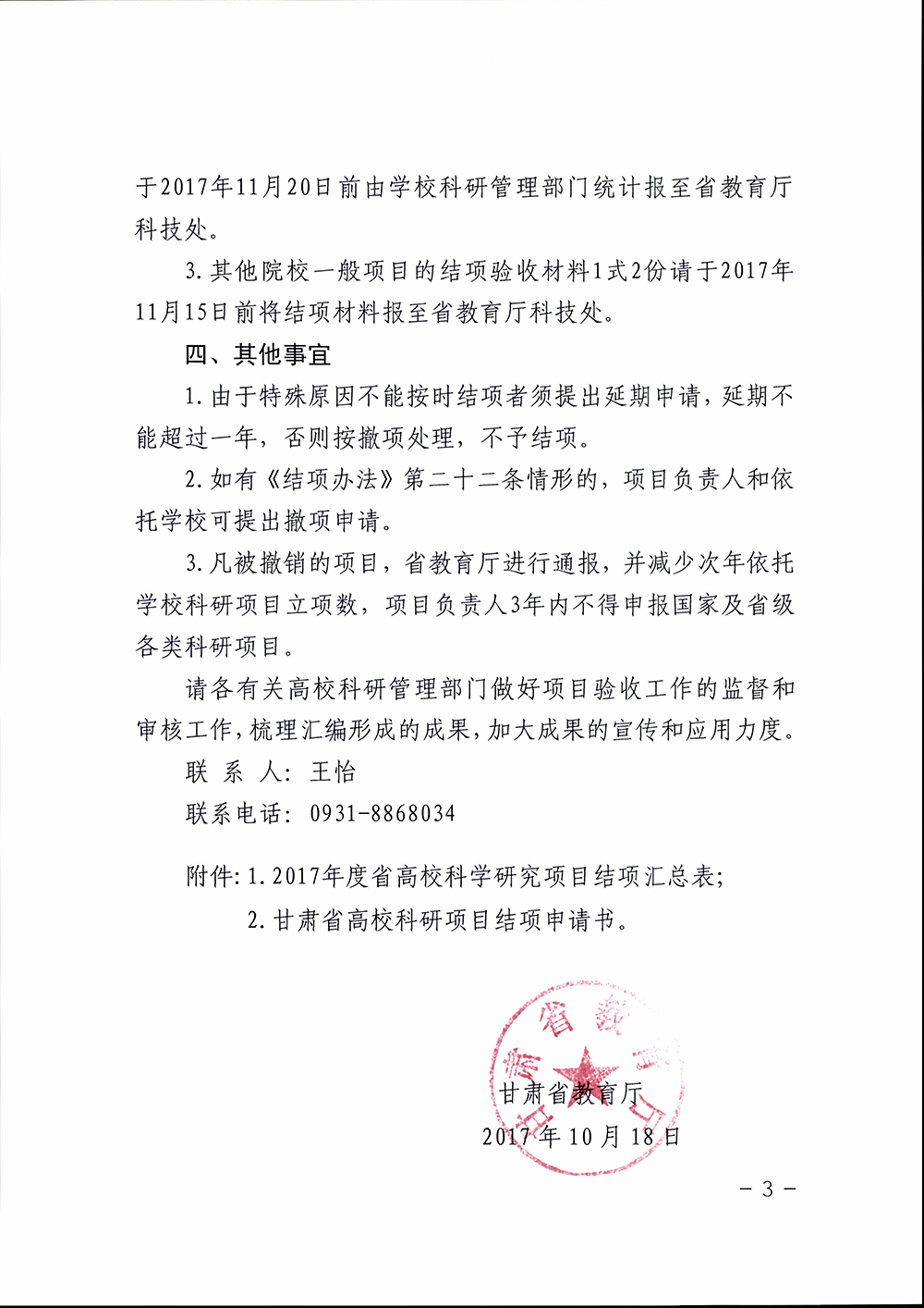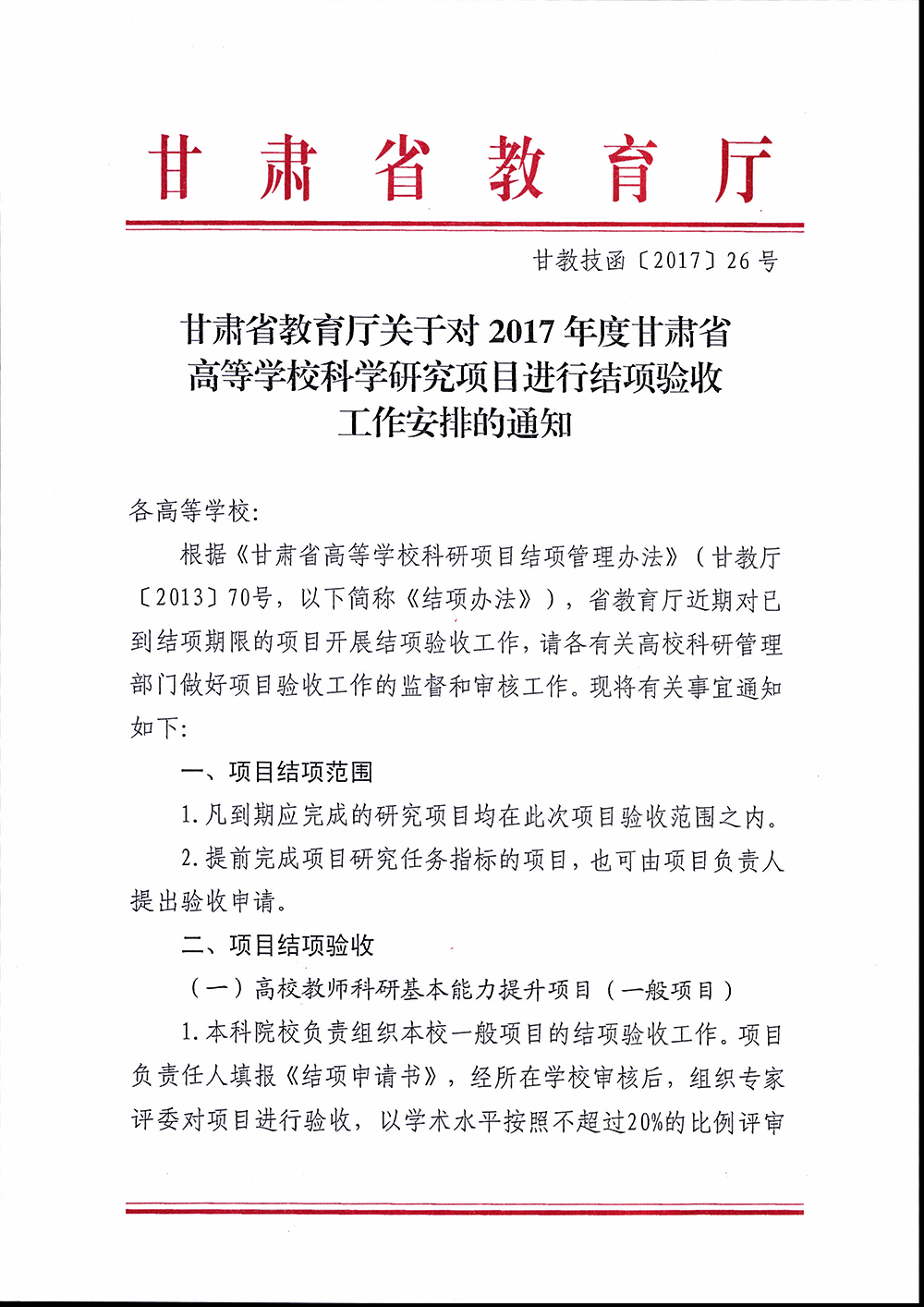 轉(zhuǎn)發(fā)甘肅省教育廳關(guān)于對2017年度甘肅省高等學??茖W研究項目進行結(jié)項驗收工作安排的通知