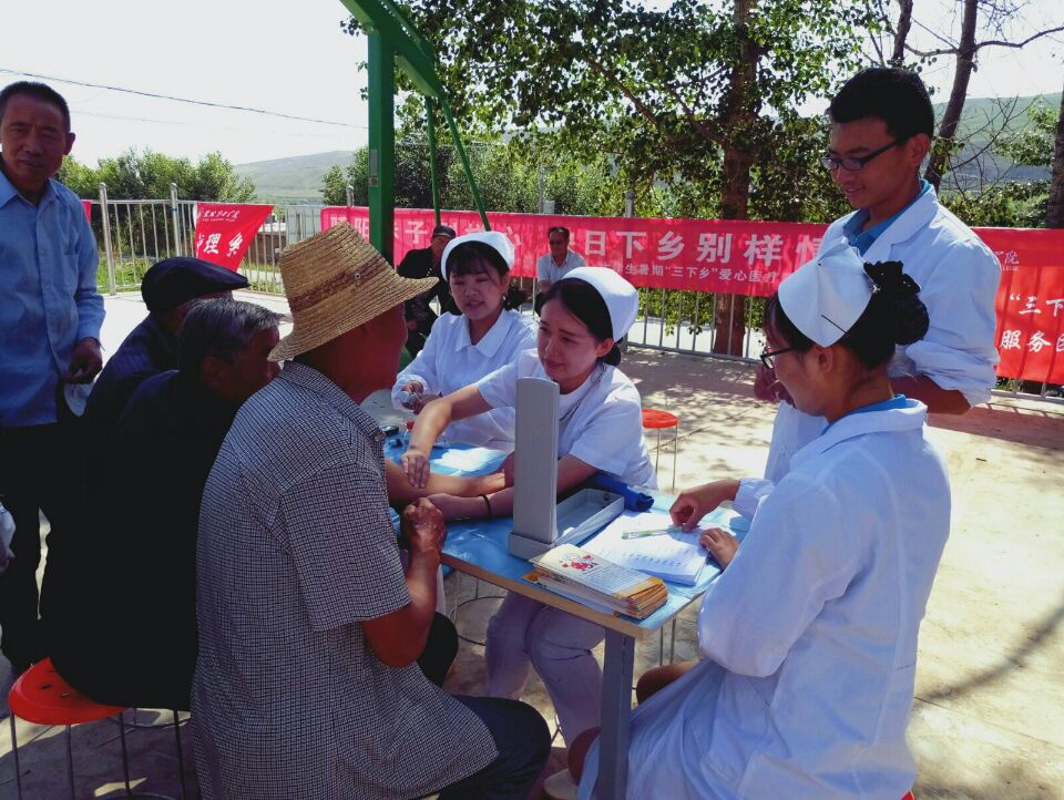 2017年暑假期間,護理系積極響應(yīng)院團委暑期“三下鄉(xiāng)”社會實踐活動的號召,組織11名學(xué)生成立了“愛心醫(yī)療服務(wù)團”,赴武威市新井村、張義鎮(zhèn)、武威第十一中學(xué)、小洪溝河灣村、沙金臺村等多地開展了為期6天的社會實踐活動。