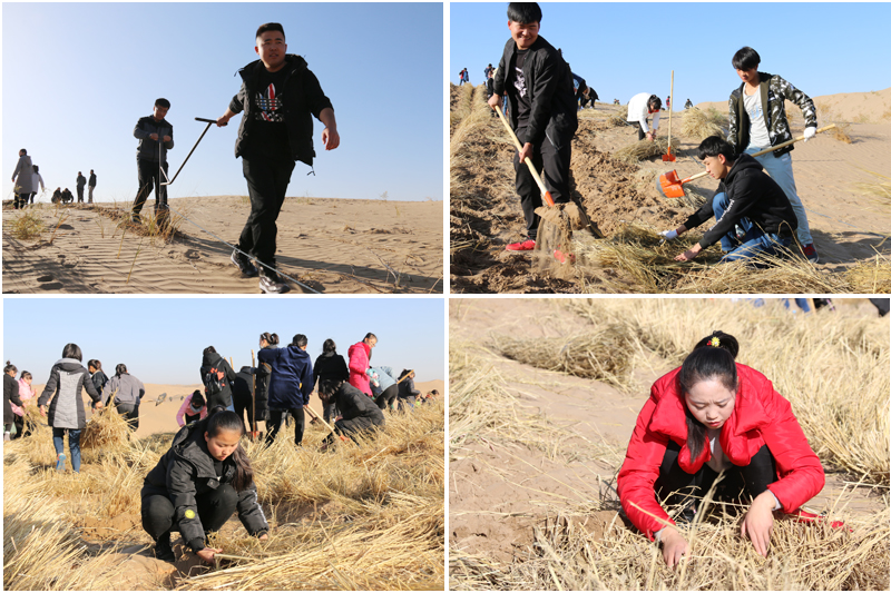在勞動現(xiàn)場,學院領導和師生們不畏冬寒,分工協(xié)作,按照標準和要求劃線開溝、蒲草培沙、等距離推進,現(xiàn)場一片熱火朝天的景象?;氖彽纳车厣砼乱?,整齊的稻草方格逐漸向遠處的沙丘覆蓋。