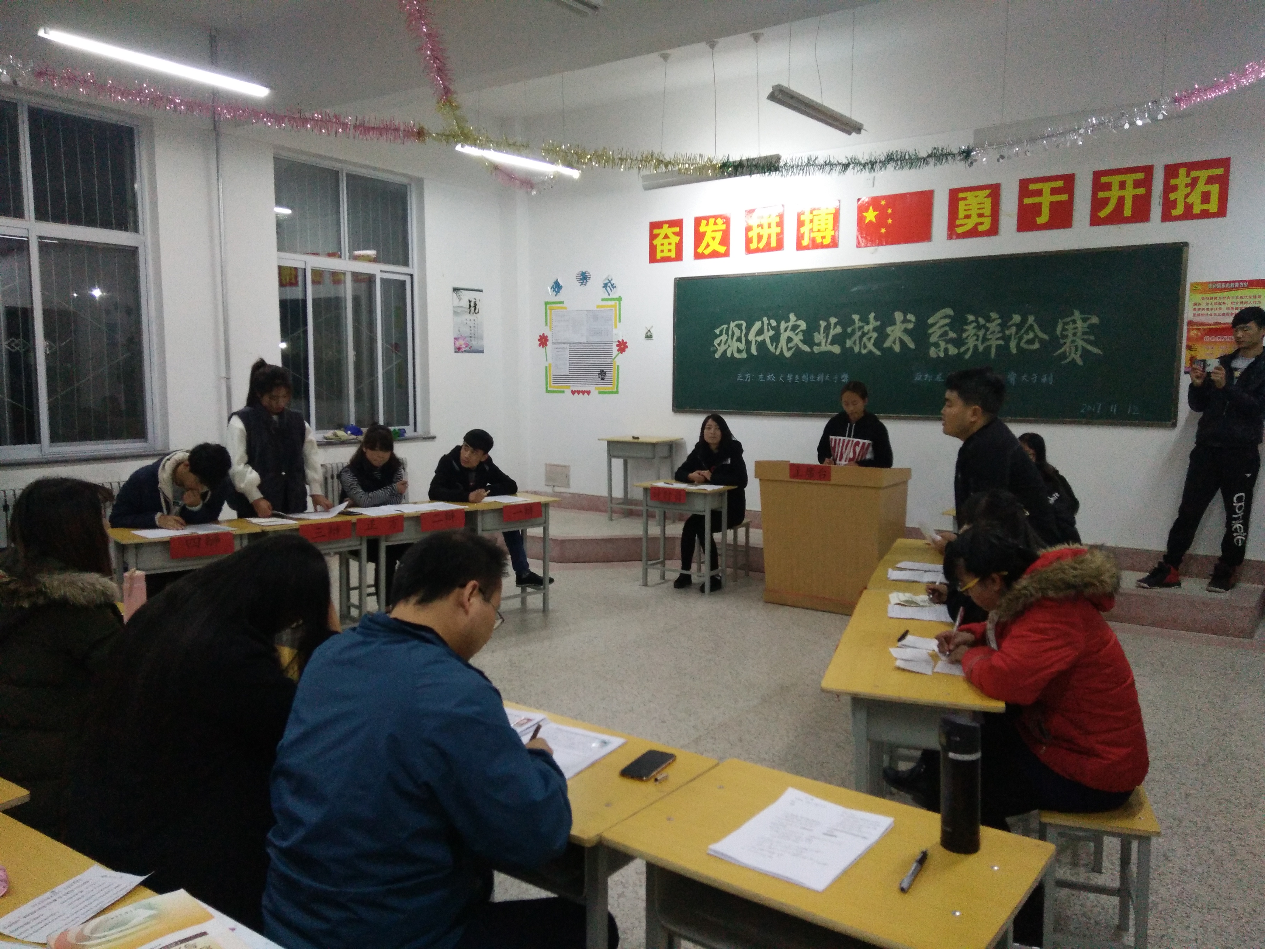 11月12日晚,現(xiàn)代農(nóng)業(yè)技術(shù)系2017年大專辯論賽決賽在行樹樓105教室成功舉行,系黨總支書記晏素珍、團(tuán)總支書記李強(qiáng)棟及青年教師擔(dān)任了評(píng)委,決賽代表隊(duì)班級(jí)、部分辯論愛好者觀看了比賽。