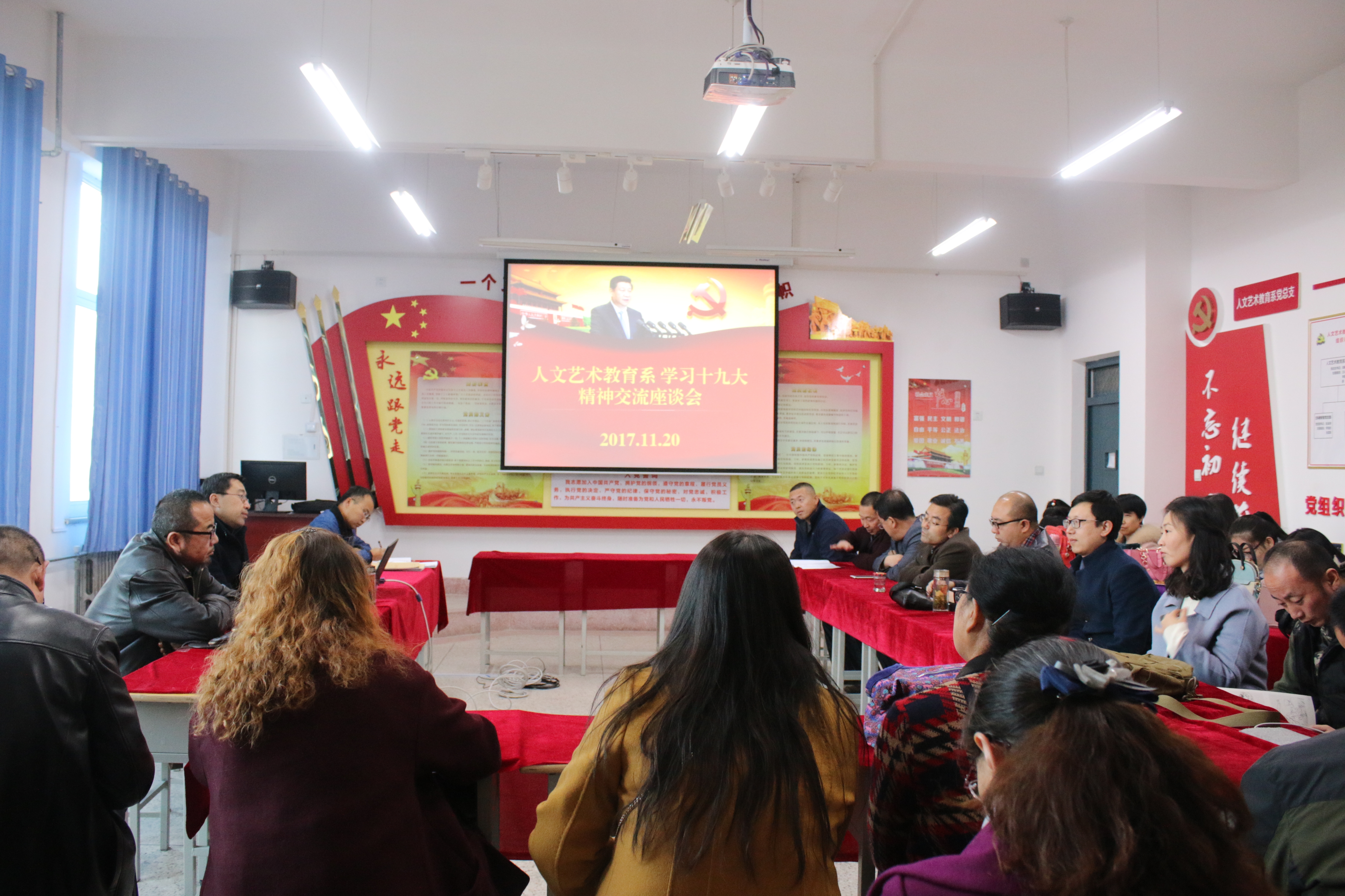 2017 年11月20日,人文藝術教育系黨總支召開了《學習黨的十九大精神——促進我系教育發(fā)展》專題座談會。會議由人文藝術教育系黨總支書記胡靜峰同志主持,系全體教師參加座談會。